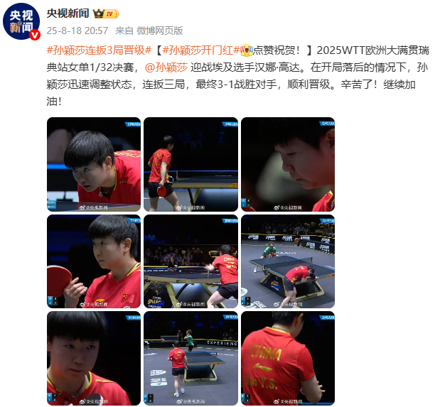 根据闭路电视新闻的报道,在2025年WTT欧洲大满贯瑞典女子单打1/32决赛中,埃及球员汉娜·冈达姆(Hannah Gundam)面对太阳。当他一开始就被抓住时,孙扬哈迅速修复了自己的州,连续三场赢得了三场比赛,并最终以3-1击败了对手并成功进步。编辑Chen Yanting