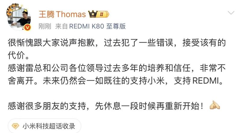 9月8日,北京新闻贝克金融(记者Chen Weicheng),北京新闻的一名记者从一些独立的消息来源获悉,小米集团发布了一封内部电子邮件,该公司决定删除中国市场部的整体中国市场营销部和总经理Wang Teng。深夜,Wang Teng道歉:“我过去犯了一个错误,并接受了价格。让我们休息一下,然后重新开始。” 9月8日,小米集团的职业伦理委员会发布了一封内部电子邮件,以报告面对王滕违反法规和学科的决定。中国市场部雇员王滕(Wang Teng)泄露了公司的机密信息,并严重违反了法规和利益冲突等学科。根据“小米组中违反法规和学科的措施”d诚信”,该公司决定将王坦解雇。根据王滕在微博中的认证信息,王滕被任命为中国市场营销部门的总统治者和Redmi Brand的总经理。中间级别管理干部。我过去遇到了一些错误,并接受了校对Jia ning。